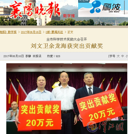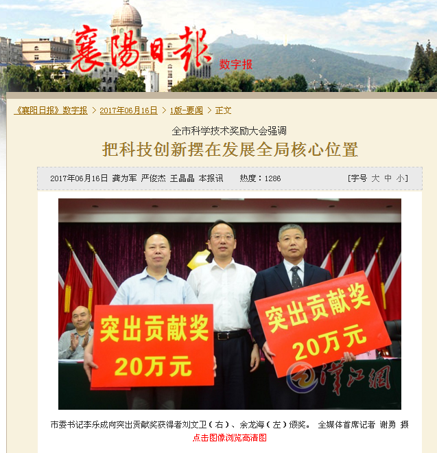 大力电工“SFC系列软起装置”荣获襄阳市科技进步一等奖,钒电池事业部总经理余龙海获得2015年度襄阳市突出贡献奖。襄阳市委书记李乐成为其颁奖。襄阳日报、襄阳晚报头版文字报道。